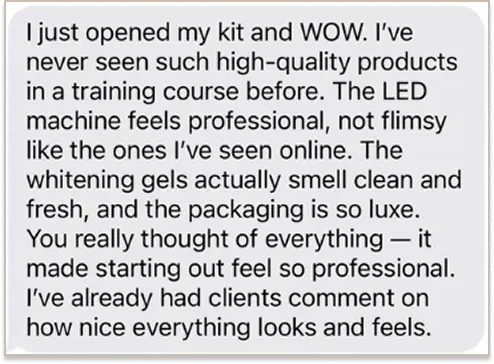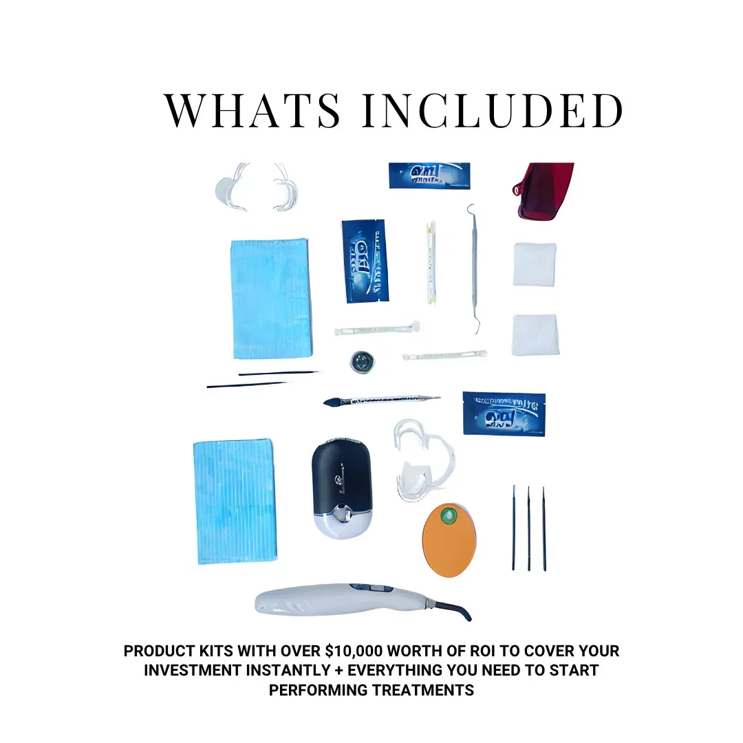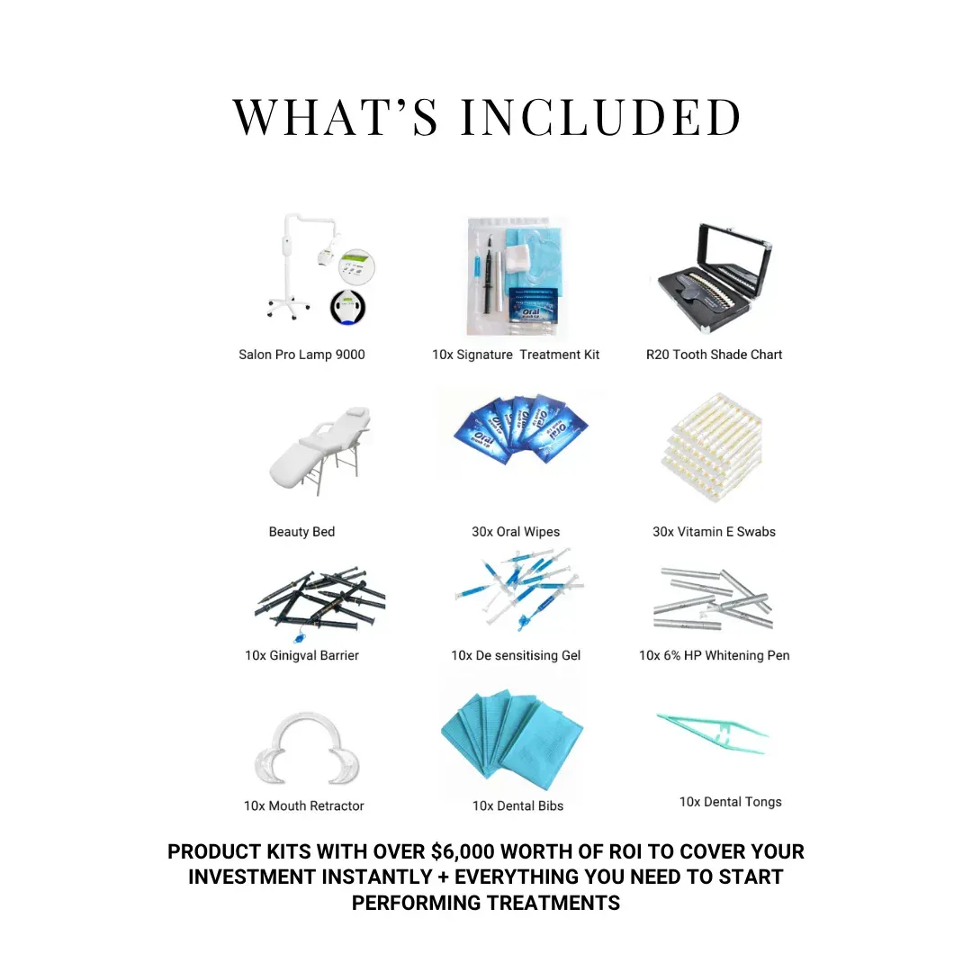 Includes premium-grade products, whitening gels, tools, PPE, aftercare, and professional-use LED machine (where applicable) - everything you need to get started immediately.